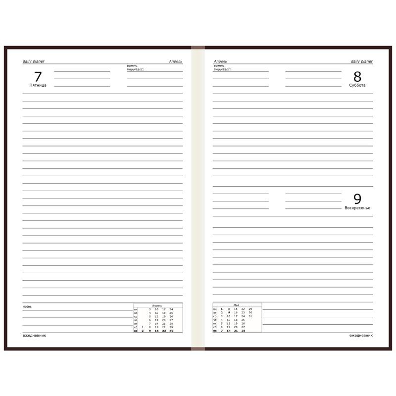 Блок: датированный на 2023 год, 160 листов (320 страницы), бумага белый офсет, плотностью 55–60 г/кв.м, печать в блоке в 1 краску. Цвет обреза белый. Содержит информационно-справочный блок — личные данные, календарь на 2023 год, автомобильные коды России, коды автоматической междугородней и международной связи, карту России. На один будний день приходится одна страница, временной интервал — 30 минут с 8:00 до 21:00 свободные строки. Нет петли для ручки. Удобен для записи переговоров, встреч.