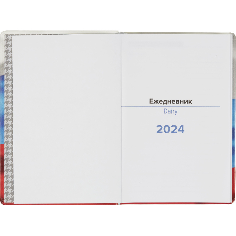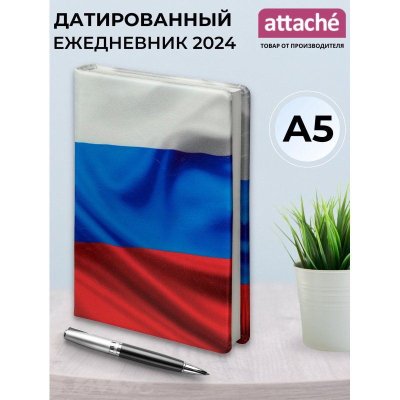 Ежедневник датированный Attache Триколор, А5, 160 л Ежедневник формата А5 датированный на 2024 год, цвет обложки: белый, синий, красный, размер 143x205 мм, ляссе белого цвета, 176 листов, белый блок с печатью в 2 краски, календарь на 2024-2027 гг. Обложка выполнена из искусственной кожи по свойствам и органолептике идентичным натуральной коже, на поверхности которой нанесена печать в виде Флага России. Обложка выполнена с поролоном. Блок: офсет 80 г/м2 (линейка). Содержит информационно-справочный блок - праздники России, международные коды городов России, цифровые коды ГИБДД, справочник неметрических единиц и перевод в метрические, размеры одежды. Вставка - алфавитный блок без вырубки. Нет петли под ручку. Поставляется в термоусадочной пленке.