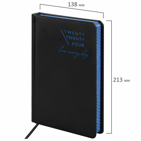 Внутренний блок включает 168 листов белой бумаги плотностью 70 г/м2. Каждая страничка имеет перфорированный угол. Благодаря стандартному формату А5 (138х213 мм) ежедневник удобно использовать как в офисе, так и на выездных деловых встречах. Жесткая книжная обложка стилизована под гладкую кожу. Материал обложки черного цвета при лазерной гравировке меняет цвет на синий. Срез ежедневника окрашен в цвет термотиснения, а форзац - в цвет обложки, что придает ему особый шарм. Дополнением является закладка-ляссе, с помощью которой при необходимости можно быстро открыть ежедневник на нужной странице. Помимо прочего, ежедневник снабжен обширным справочным материалом.