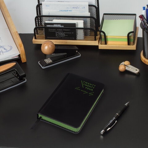 Внутренний блок включает 168 листов белой бумаги плотностью 70 г/м2. Каждая страничка имеет перфорированный угол. Благодаря малому формату А6 (100х150 мм) ежедневник удобно использовать как в офисе, так и на выездных деловых встречах. Жесткая книжная обложка стилизована под гладкую кожу черного цвета. Материал обложки подходит для тиснения фольгой, а при лазерной гравировке меняет черный цвет на зеленый. Срез ежедневника окрашен в цвет термотиснения, а форзац в цвет обложки, что придает ему особый шарм. Дополнением является закладка-ляссе, с помощью которой при необходимости можно быстро открыть ежедневник на нужной странице. Помимо прочего, ежедневник снабжен обширным справочным материалом.