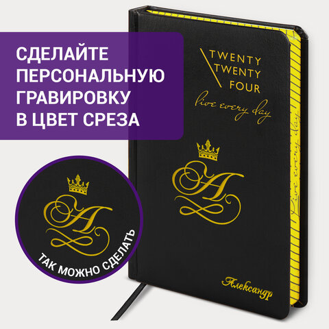 Внутренний блок включает 168 листов белой бумаги плотностью 70 г/м2. Каждая страничка имеет перфорированный угол. Благодаря стандартному формату А5 (138х213 мм) ежедневник удобно использовать как в офисе, так и на выездных деловых встречах. Жесткая книжная обложка стилизована под гладкую кожу. Материал обложки черного цвета при лазерной гравировке меняет цвет на желтый. Срез ежедневника окрашен в цвет термотиснения, а форзац - в цвет обложки, что придает ему особый шарм. Дополнением является закладка-ляссе, с помощью которой при необходимости можно быстро открыть ежедневник на нужной странице. Помимо прочего, ежедневник снабжен обширным справочным материалом.