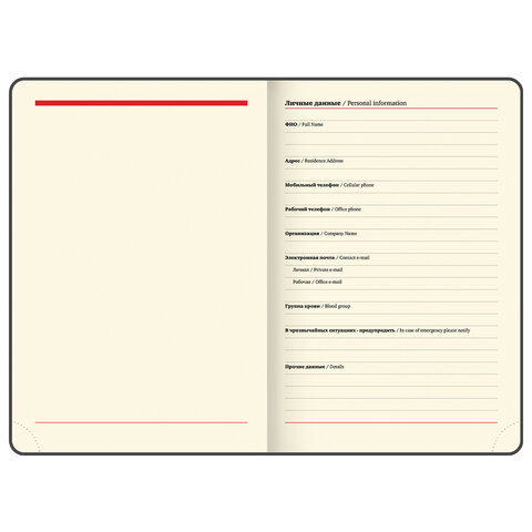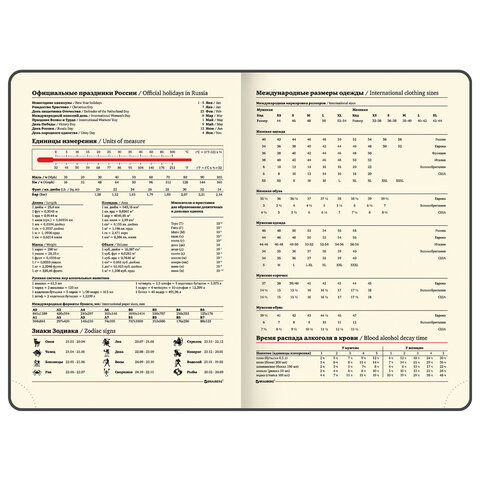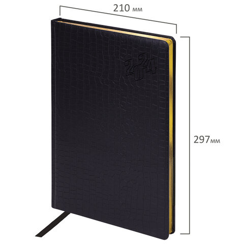 Внутренний блок включает 168 листов тонированной бумаги плотностью 70 г/м2. Каждая страничка имеет перфорированный угол. Благодаря большому формату А4 (210x297 мм) ежедневник удобно использовать как в офисе, так и на выездных деловых встречах. Твердая обложка стилизована под кожу крокодила классического черного цвета. Материал обложки подходит для горячего тиснения. Срез ежедневника фольгирован золотой фольгой, что придает ему особый шарм. Дополнением является закладка-ляссе, с помощью которой при необходимости можно быстро открыть ежедневник на нужной странице. Помимо прочего, ежедневник снабжен обширным справочным материалом.
