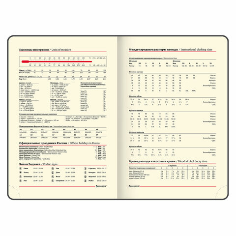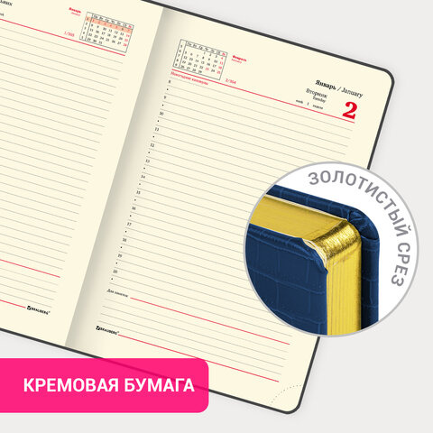 Внутренний блок включает 168 листов тонированной бумаги плотностью 70 г/м2. Каждая страничка имеет перфорированный угол. Благодаря стандартному формату А5 (138х213 мм) ежедневник удобно использовать как в офисе, так и на выездных деловых встречах. Твердая обложка стилизована под кожу крокодила. Материал обложки насыщенного синего цвета подходит для горячего тиснения. Срез ежедневника фольгирован золотой фольгой, что придает ему особый шарм. Дополнением является закладка-ляссе, с помощью которой при необходимости можно быстро открыть ежедневник на нужной странице. Помимо прочего, ежедневник снабжен обширным справочным материалом.