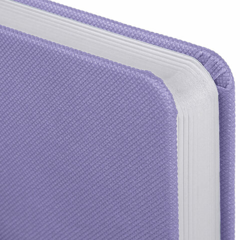 Внутренний блок включает 168 листов белой бумаги плотностью 70 г/м2. Каждая страничка имеет перфорированный угол. Благодаря стандартному формату А5 (138х213 мм) ежедневник удобно использовать как в офисе, так и на выездных деловых встречах. Жесткая книжная обложка в нежном сиреневом цвете стилизована под искусственную кожу с мелким рисунком, фиксируется резинкой, поэтому ежедневник не откроется в сумке или портфеле и страницы не помнутся. Материал обложки подходит для горячего тиснения. Для удобства пользования ежедневник снабжен держателем для фиксации ручки. Дополнением является закладка-ляссе, с помощью которой при необходимости можно быстро открыть ежедневник на нужной странице. Помимо прочего, ежедневник снабжен обширным справочным материалом.