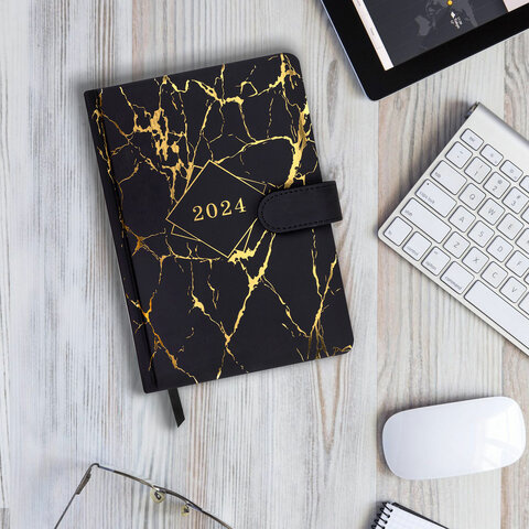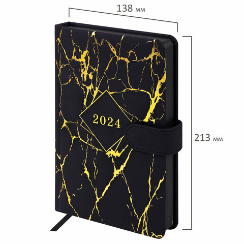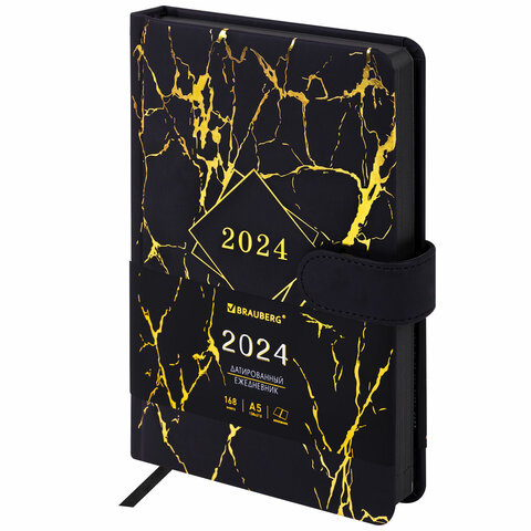 Ежедневник датированный Brauberg Goldy черный, A5, под кожу, цветной срез, 2024