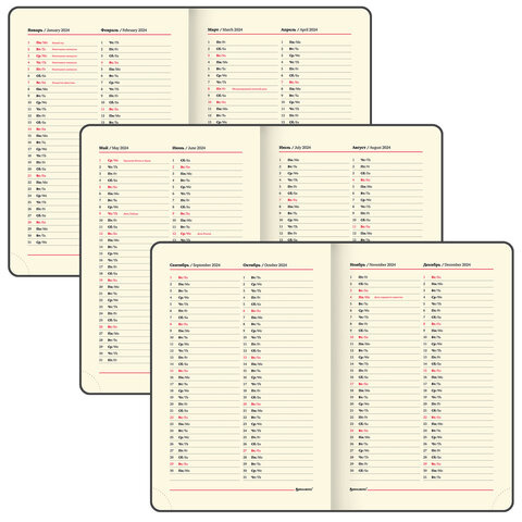Материал обложки подходит для горячего тиснения. Цветной срез в цвет обложки придает ежедневнику особый шарм. Дополнением является закладка-ляссе, с помощью которой при необходимости можно быстро открыть ежедневник на нужной странице. Помимо прочего, ежедневник снабжен обширным справочным материалом.