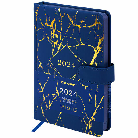 Ежедневник датированный Brauberg Goldy синий, A5, под кожу, цветной срез, 2024