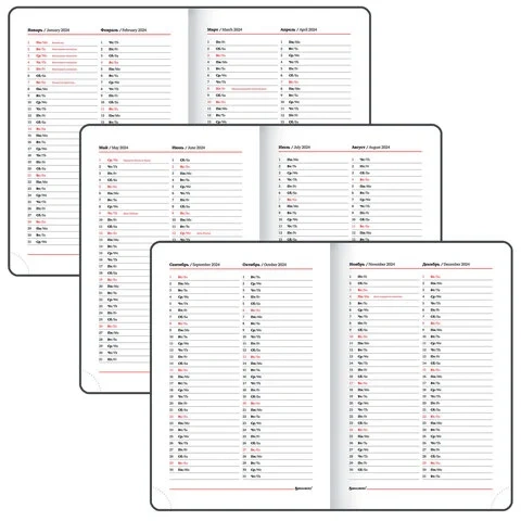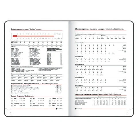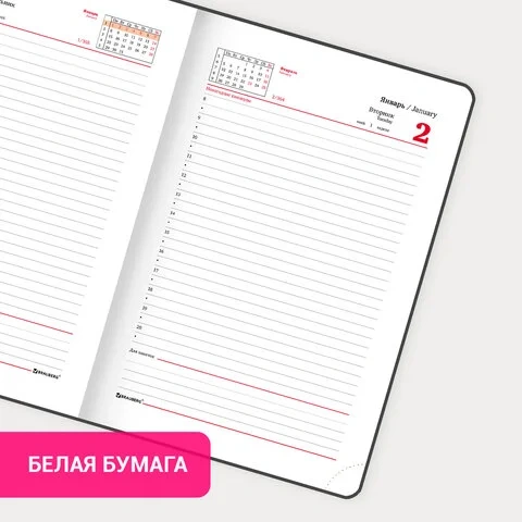 Внутренний блок включает 168 листов белой бумаги плотностью 70 г/м2. Каждая страничка имеет перфорированный угол. Благодаря стандартному формату А5 (138х213 мм) ежедневник удобно использовать как в офисе, так и на выездных деловых встречах.