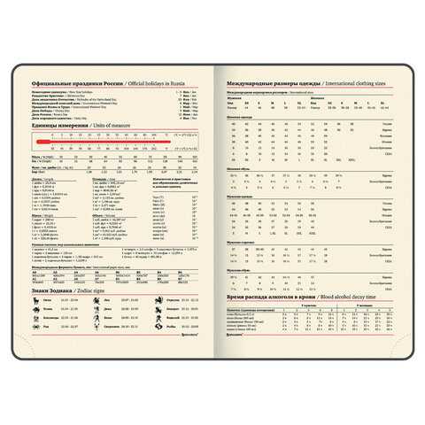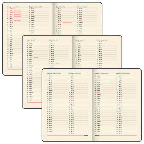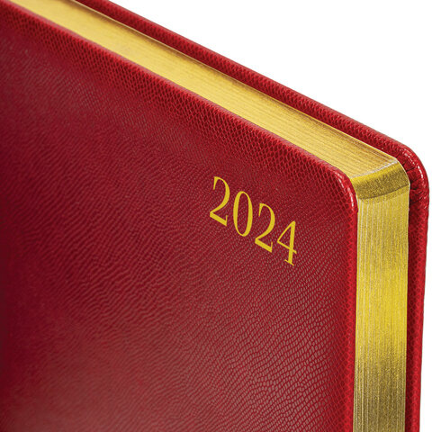Внутренний блок включает 168 листов тонированной бумаги плотностью 70 г/м2. Каждая страничка имеет перфорированный угол. Благодаря большому формату А4 (210х297 мм) ежедневник удобно использовать как в офисе, так и на выездных деловых встречах. Твердая обложка красного цвета стилизована под кожу рептилии. Подходит для горячего тиснения. Срез ежедневника фольгирован золотой фольгой, что придает ему особый шарм. Дополнением является закладка-ляссе, с помощью которой при необходимости можно быстро открыть ежедневник на нужной странице. Помимо прочего, ежедневник снабжен обширным справочным материалом.