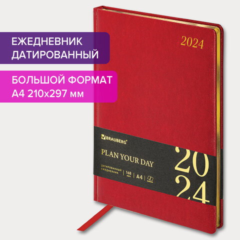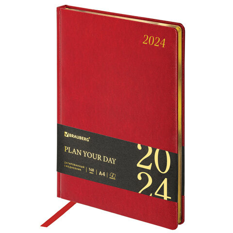 Ежедневник датированный Brauberg Iguana красный, А4, под кожу, 2024