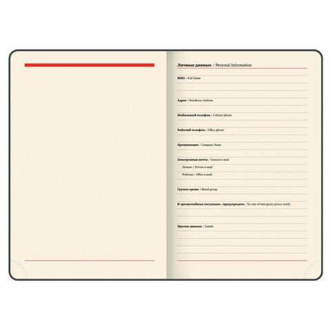 Внутренний блок включает 168 листов тонированной бумаги плотностью 70 г/м2. Каждая страничка имеет перфорированный угол. Благодаря большому формату А4 (210х297 мм) ежедневник удобно использовать как в офисе, так и на выездных деловых встречах. Твердая обложка благородного синего цвета с легкой рельефной фактурой, напоминающей натуральную кожу, прошита по периметру. Материал обложки подходит для горячего тиснения. Дополнением является закладка-ляссе, с помощью которой при необходимости можно быстро открыть ежедневник на нужной странице. Помимо прочего, ежедневник снабжен обширным справочным материалом.