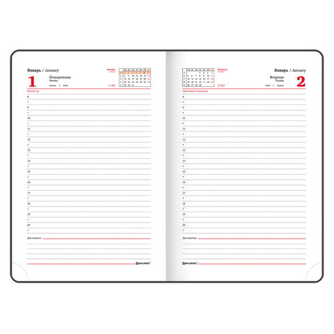Внутренний блок включает 168 листов белой бумаги плотностью 70 г/м2. Каждая страничка имеет перфорированный угол. Благодаря стандартному формату А5 (138х213 мм) датированный ежедневник удобно использовать как в офисе, так и на выездных деловых встречах. Жесткая книжная обложка, прошитая по периметру, с легкой рельефной фактурой, напоминающей натуральную кожу, фиксируется магнитной застежкой, поэтому ежедневник не откроется в сумке или портфеле и страницы не помнутся.