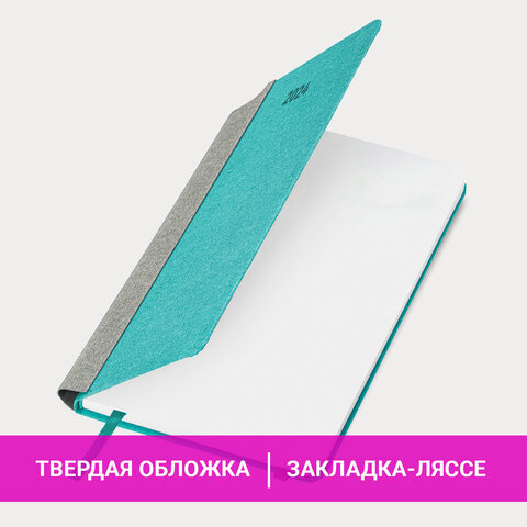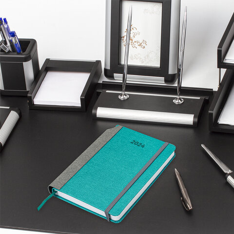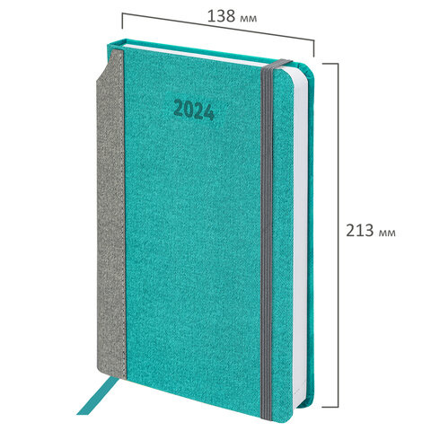 Внутренний блок включает 168 листов белой бумаги плотностью 70 г/м2. Каждая страничка имеет перфорированный угол. Благодаря стандартному формату А5 (138х213 мм) ежедневник удобно использовать как в офисе, так и на выездных деловых встречах. Жесткая книжная обложка стилизована под искусственную кожу с текстурой льна, фиксируется резинкой, поэтому ежедневник не откроется в сумке или портфеле и страницы не помнутся. Материал обложки подходит для горячего тиснения. Для удобства пользования ежедневник снабжен карманом для фиксации ручки. Дополнением является закладка-ляссе, с помощью которой при необходимости можно быстро открыть ежедневник на нужной странице. Помимо прочего, ежедневник снабжен обширным справочным материалом. Выполнен в стильном сочетании бирюзового и серого цветов.