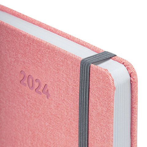Внутренний блок включает 168 листов белой бумаги плотностью 70 г/м2. Каждая страничка имеет перфорированный угол. Благодаря стандартному формату А5 (138х213 мм) ежедневник удобно использовать как в офисе, так и на выездных деловых встречах. Жесткая книжная обложка стилизована под искусственную кожу с текстурой льна, фиксируется резинкой, поэтому ежедневник не откроется в сумке или портфеле и страницы не помнутся.