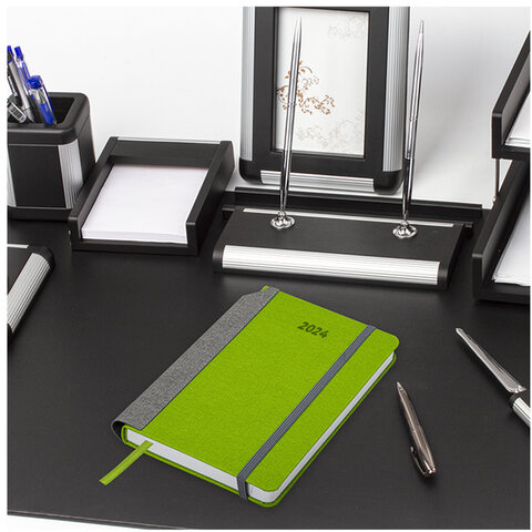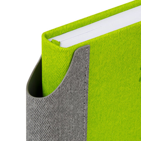 Внутренний блок включает 168 листов белой бумаги плотностью 70 г/м2. Каждая страничка имеет перфорированный угол. Благодаря стандартному формату А5 (138х213 мм) ежедневник удобно использовать как в офисе, так и на выездных деловых встречах. Жесткая книжная обложка стилизована под искусственную кожу с текстурой льна, фиксируется резинкой, поэтому ежедневник не откроется в сумке или портфеле и страницы не помнутся.