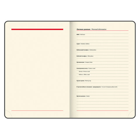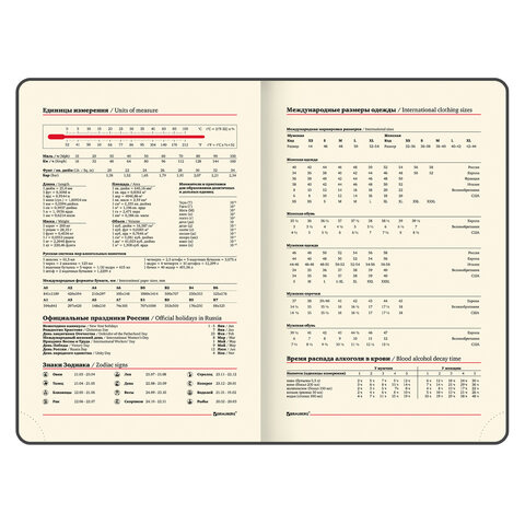 Снабжен резинкой-фиксатором, благодаря чему ежедневник не откроется в сумке или портфеле. Дополнением является закладка-ляссе, с помощью которой при необходимости можно быстро открыть ежедневник на нужной странице и держатель для ручки. Помимо прочего, ежедневник снабжен справочным материалом.