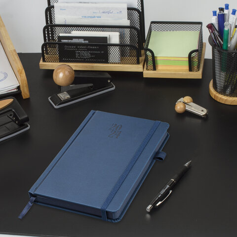 Ежедневник датированный Brauberg Plain синий, A5, под кожу, с резинкой, 2024