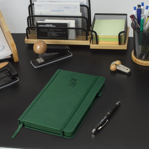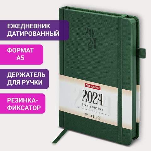 Ежедневник датированный Brauberg Plain темно-зеленый, A5, под кожу, с резинкой, 2024