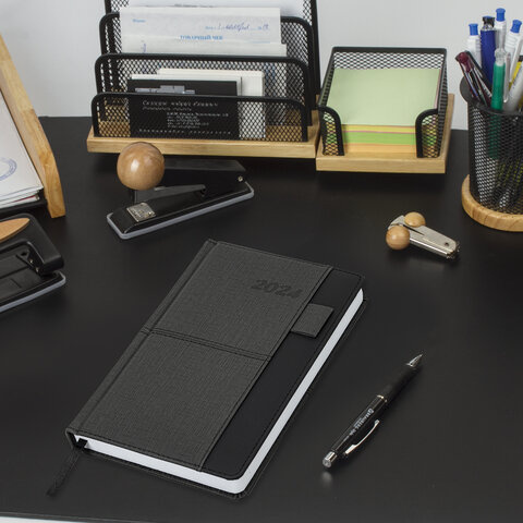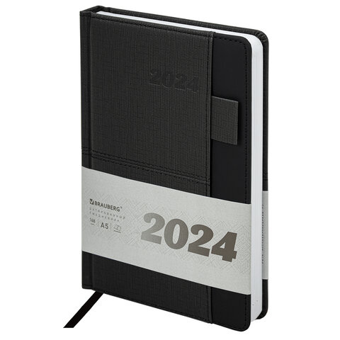 Ежедневник датированный Brauberg Pocket черный, A5, под кожу, карман, держатель для ручки, 2024