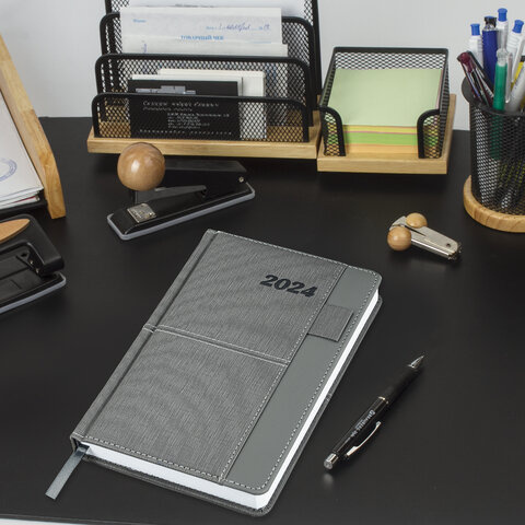 Ежедневник датированный Brauberg Pocket серый, A5, под кожу, карман, держатель для ручки, 2024