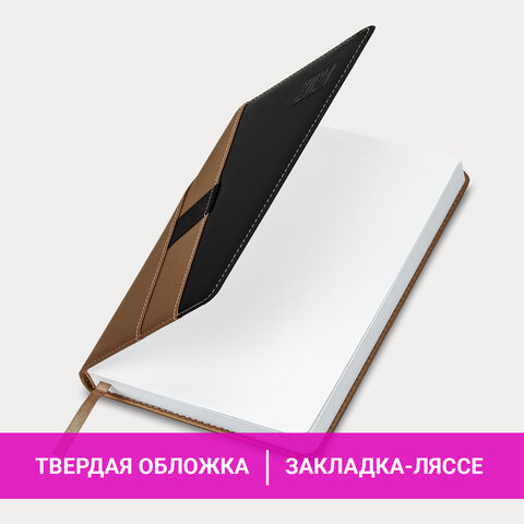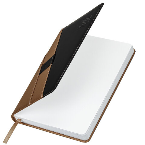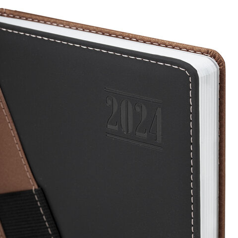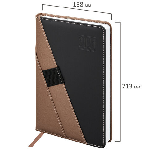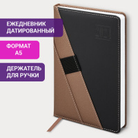 Внутренний блок включает 168 листов белой бумаги плотностью 70 г/м2. Каждая страничка имеет перфорированный угол. Благодаря стандартному формату А5 (138х213 мм) датированный ежедневник удобно использовать как в офисе, так и на выездных деловых встречах. Подходит для горячего тиснения. Дополнением является закладка-ляссе, с помощью которой при необходимости можно быстро открыть ежедневник на нужной странице и держателем для ручки. Помимо прочего, ежедневник снабжен справочным материалом. Выполнен в стильном сочетании коричневого и черного цветов.