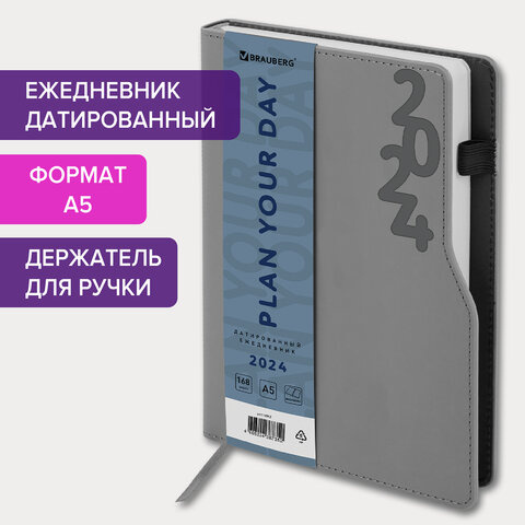 Ежедневник датированный Brauberg Up серый, A5, под кожу софт-тач, держатель для ручки, 2024