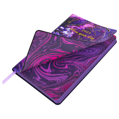 Внутренний блок включает 168 листов белой бумаги плотностью 70 г/м2. Каждая страничка имеет перфорированный угол. Благодаря стандартному формату А5 (138х213 мм) ежедневник удобно использовать как в офисе, так и на выездных деловых встречах. Мягкая интегральная обложка стилизована под гладкую кожу и имеет яркий дизайнерский принт. Материал обложки подходит для горячего тиснения. Цветной форзац и срез придает ежедневнику особый шарм. Дополнением является закладка-ляссе, с помощью которой при необходимости можно быстро открыть ежедневник на нужной странице. Помимо прочего, ежедневник снабжен обширным справочным материалом.