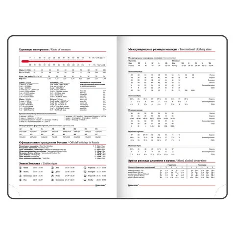 Внутренний блок включает 168 листов белой бумаги плотностью 70 г/м2. Каждая страничка имеет перфорированный угол. Благодаря стандартному формату А5 (138х213 мм) ежедневник удобно использовать как в офисе, так и на выездных деловых встречах. Мягкая интегральная обложка стилизована под гладкую кожу. Материал обложки подходит для горячего тиснения. Цветной форзац и срез придает ежедневнику особый шарм. Дополнением является закладка-ляссе, с помощью которой при необходимости можно быстро открыть ежедневник на нужной странице. Помимо прочего, ежедневник снабжен обширным справочным материалом.