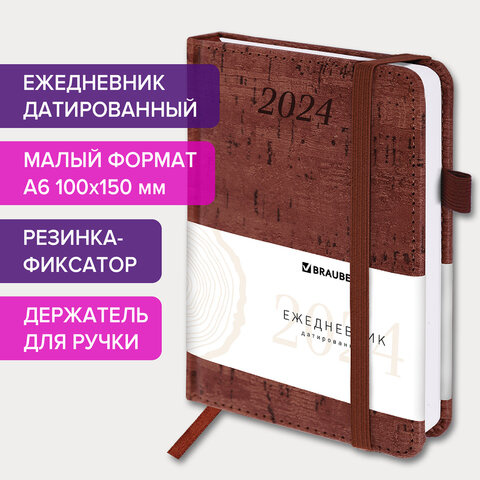 Ежедневник датированный Brauberg Wood коричневый, А6, под кожу, 2024
