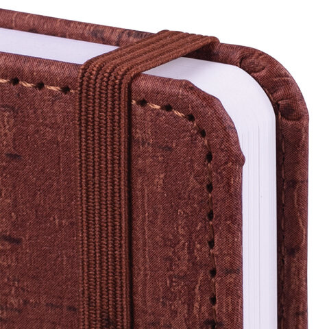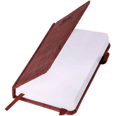 Внутренний блок включает 168 листов белой бумаги плотностью 70 г/м2. Каждая страничка имеет перфорированный угол. Благодаря малому формату А6 (100х150 мм) ежедневник удобно использовать как в офисе, так и на выездных деловых встречах. Твердая обложка коричневого цвета стилизованная под благородное дерево. Подходит для горячего тиснения. Снабжен резинкой-фиксатором, благодаря чему ежедневник не откроется в сумке или портфеле. Дополнением является закладка-ляссе, с помощью которой при необходимости можно быстро открыть ежедневник на нужной странице. Помимо прочего, ежедневник снабжен справочным материалом.