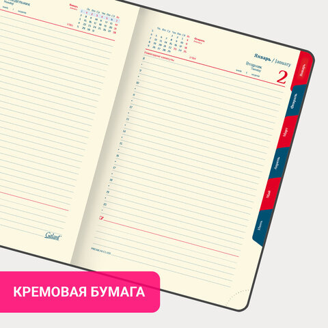 Дополнением является закладка-ляссе, с помощью которой при необходимости можно быстро открыть ежедневник на нужной странице, а также вырубка по месяцам. Помимо прочего, ежедневник снабжен обширным справочным материалом. Выполнен в благородном черном цвете.