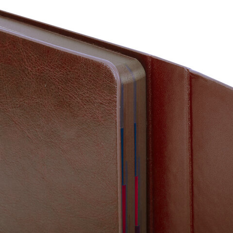 Внутренний блок включает 168 листов тонированной бумаги плотностью 70 г/м2. Каждая страничка имеет перфорированный угол. Благодаря стандартному формату А5 (148х218 мм) ежедневник удобно использовать как в офисе, так и на выездных деловых встречах. Интегральная обложка стилизована под гладкую кожу благородного коричневого цвета, фиксируется магнитным клапаном, поэтому ежедневник не откроется в сумке или портфеле и страницы не помнутся. Подходит для горячего тиснения. Срез и форзац ежедневника окрашены в цвет обложки, что придает ему особый шарм. Дополнением является закладка-ляссе, с помощью которой при необходимости можно быстро открыть ежедневник на нужной странице, а также вырубка по месяцам. Помимо прочего, ежедневник снабжен обширным справочным материалом.