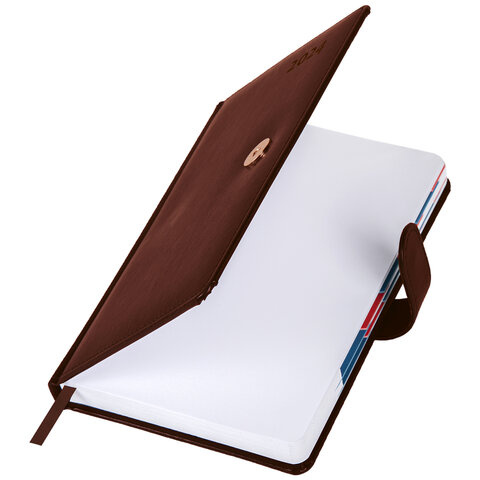 Внутренний блок включает 168 листов белой бумаги плотностью 70 г/м2. Каждая страничка имеет перфорированный угол. Благодаря стандартному формату А5 (148х218 мм) ежедневник удобно использовать как в офисе, так и на выездных деловых встречах. Твердая обложка, прошитая по периметру, стилизованная под гладкую кожу, фиксируется магнитной застежкой, поэтому ежедневник не откроется в сумке или портфеле и страницы не помнутся. Материал обложки подходит для горячего тиснения.