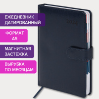 Внутренний блок включает 168 листов белой бумаги плотностью 70 г/м2. Каждая страничка имеет перфорированный угол. Благодаря стандартному формату А5 (148х218 мм) ежедневник удобно использовать как в офисе, так и на выездных деловых встречах. Твердая обложка, прошитая по периметру, стилизованная под гладкую кожу, фиксируется магнитной застежкой, поэтому ежедневник не откроется в сумке или портфеле и страницы не помнутся. Материал обложки подходит для горячего тиснения. Дополнением является закладка-ляссе, с помощью которой при необходимости можно быстро открыть ежедневник на нужной странице, а также вырубка по месяцам. Помимо прочего, ежедневник снабжен обширным справочным материалом. Выполнен в классическом темно-синем цвете.