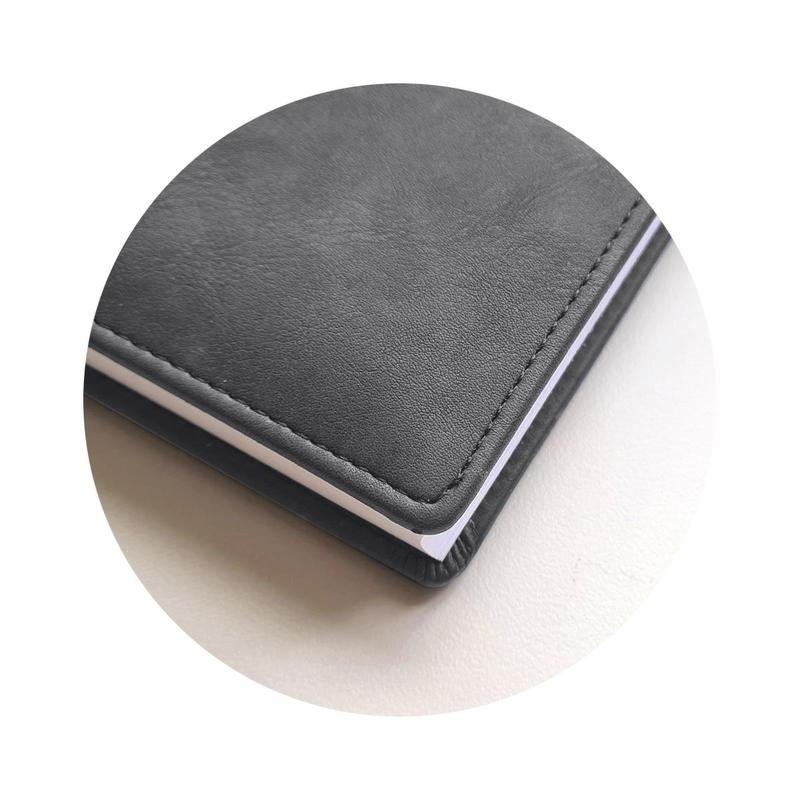 Твердая с поролоном обложка из приятной искусственной кожи с тиснением, нашивкой с клепками и прострочкой по периметру имеет скругленные уголки и удобный кармашек для мелочей на нахзаце. Благодаря крепкому ниткошвейному скреплению ежедневник верно прослужит весь год.