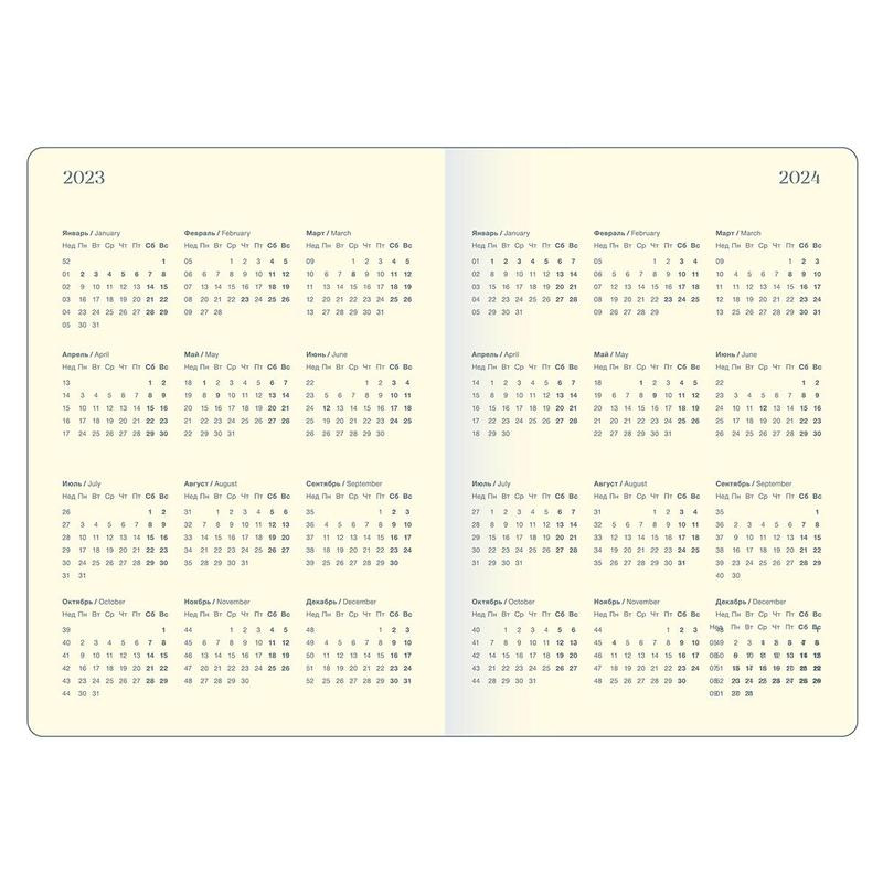 Датированный внутренний блок в линейку на 176 листов (352 страницы) — из высококачественной бумаги цвета слоновой кости плотностью 70 г/м2 со скругленными уголками. Информационный блок ежедневника включает в себя: титульный лист, календари на2023—2024 гг. , раздел «планы на год», развороты для заметок в начале и конце блока, планнер перед каждым месяцем.