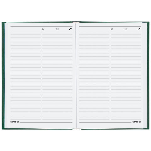 Внутренний блок включает 160 листов белой бумаги плотностью 65 г/м2. Благодаря стандартному формату А5 (145х215 мм) ежедневник удобно использовать как в офисе, так и на выездных деловых встречах. Жесткая книжная обложка, покрытая бумвинилом, делает данный ежедневник надежным и практичным в применении. Материал обложки подходит для тиснения фольгой. Помимо прочего, ежедневник снабжен обширным справочным материалом. Выполнен в строгом классическом зеленом цвете с тиснением.