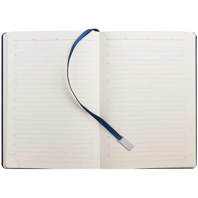 Ежедневник с твердой обложкой, выполнен из материала Nebraska, синий НН, дополнен ляссе в цвет обложки с металлической шильдой. Блок 986:Кол-во страниц — 256; Бумага — тонированная, плотность 70 г/м; Форзац и нахзац — тонированные.