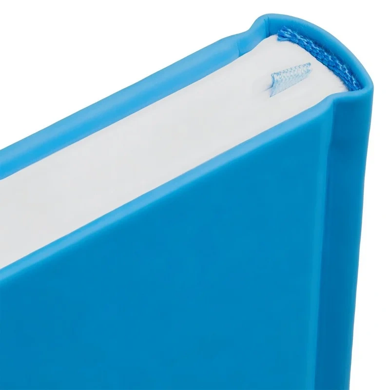 Ежедневник с твердой обложкой без поролона, выполнен из материала Soft Touch Ultra, голубой JJ, дополнен резинкой шириной 1 см, петлей-резинкой для ручки, капталом и ляссе голубого цвета. Кол-во страниц — 336; Бумага — белая, плотность 70 г/м; Форзац и нахзац — белого цвета. Шильда на резинку поставляется отдельно. Услуга сборки добавляет к сроку выполнения заказа 3 рабочих дня. От сборки можно отказаться, написав об этом в примечании к заказу.