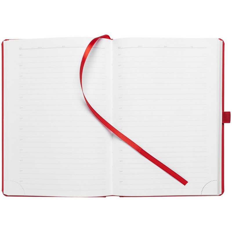 Ежедневник с твердой обложкой без поролона, выполнен из материала Soft Touch Ultra, красный РР, дополнен резинкой шириной 1 см, петлей-резинкой для ручки, капталом и ляссе красного цвета. Кол-во страниц — 336; Бумага — белая, плотность 70 г/м; Форзац и нахзац — белого цвета. Шильда на резинку поставляется отдельно. Услуга сборки добавляет к сроку выполнения заказа 3 рабочих дня. От сборки можно отказаться, написав об этом в примечании к заказу.