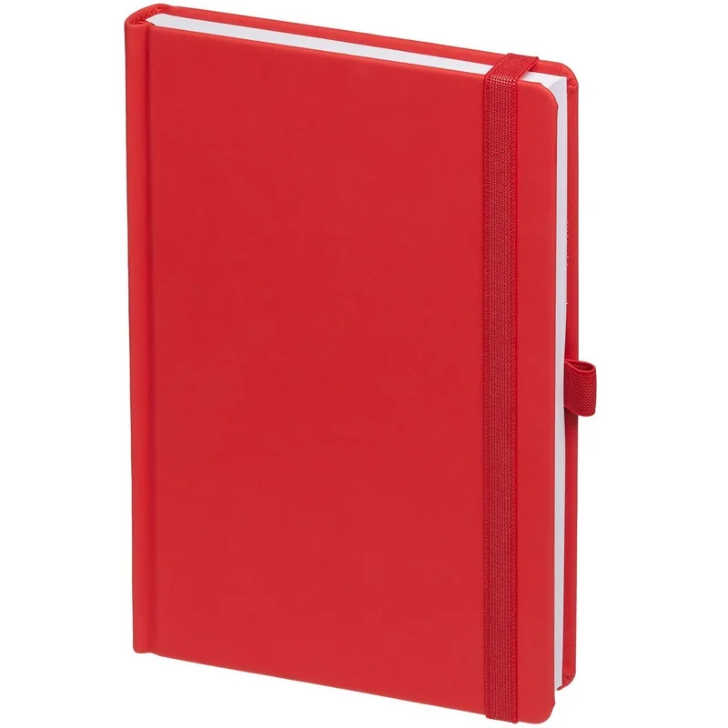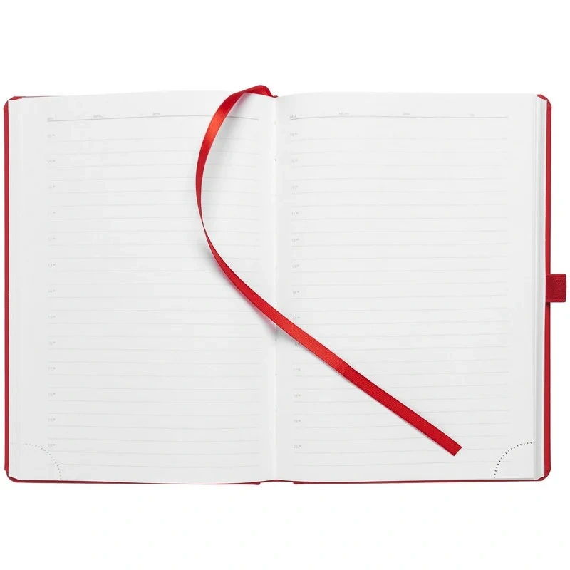 Ежедневник с твердой обложкой без поролона, выполнен из материала Soft Touch Ultra, красный РР, дополнен резинкой шириной 1 см, петлей-резинкой для ручки, капталом и ляссе красного цвета. Кол-во страниц — 336; Бумага — белая, плотность 70 г/м; Форзац и нахзац — белого цвета.