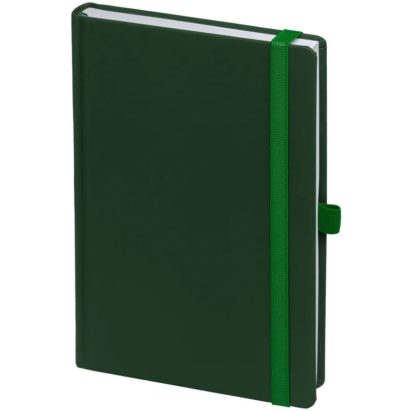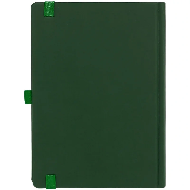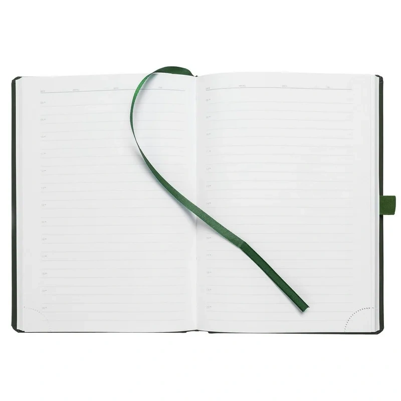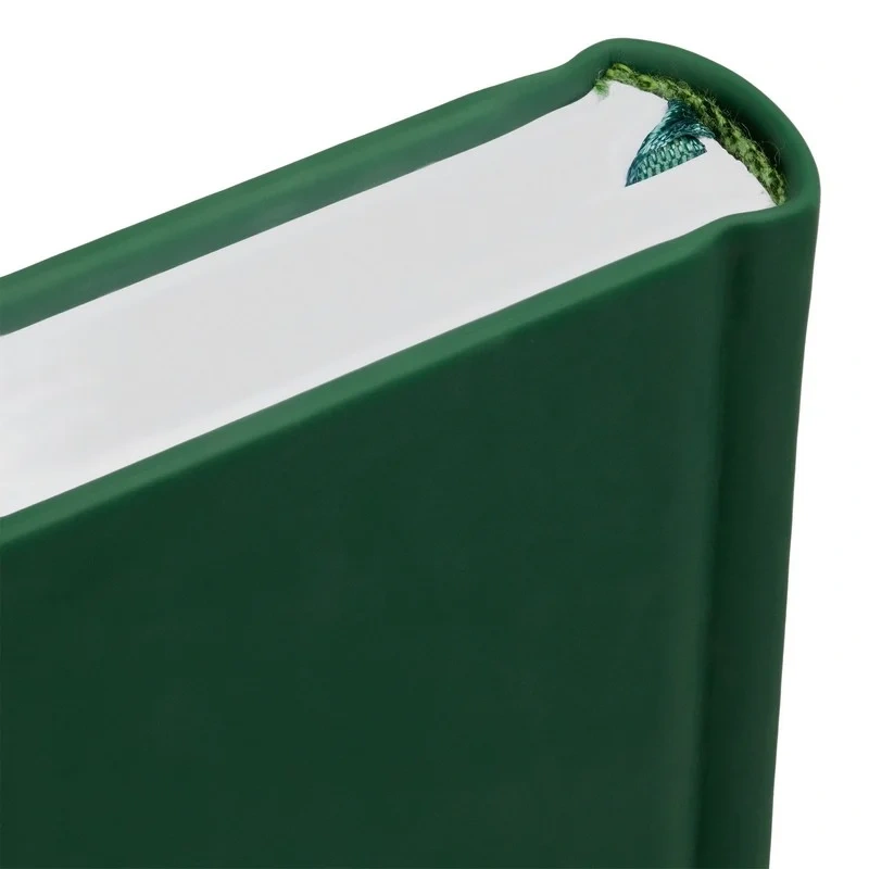 Ежедневник с твердой обложкой без поролона, выполнен из материала Soft Touch, зеленый FF, дополнен резинкой шириной 1 см, петлей-резинкой для ручки, капталом и ляссе в цвет обложки. Кол-во страниц — 336; Бумага — белая, плотность 70 г/м; Форзац и нахзац — белого цвета.