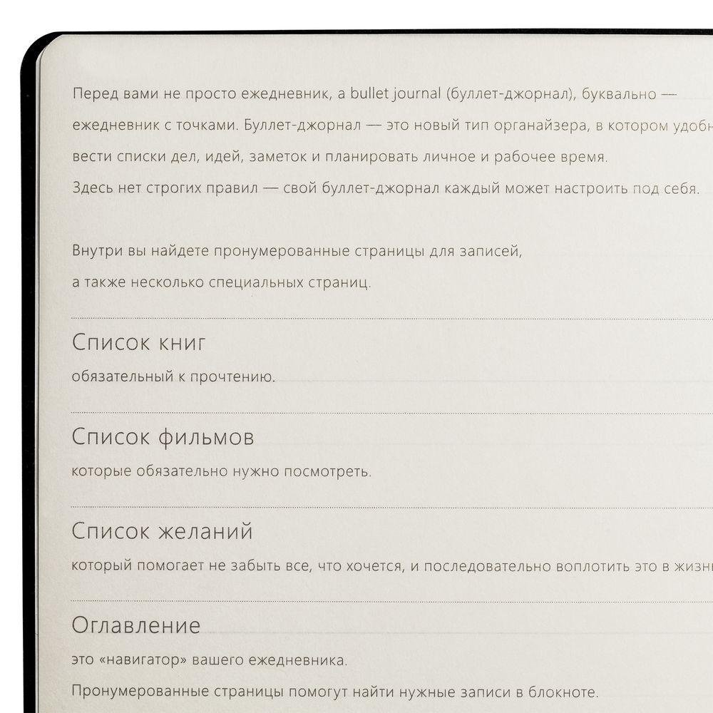 Перед вами не просто ежедневник, а bullet journal (буллет-джорнал), буквально — ежедневник с точками. Буллет-джорнал — это новый тип органайзера, в котором удобно вести списки дел, идей, заметок и планировать личное и рабочее время. Здесь нет строгих правил — свой буллет-джорнал каждый может настроить под себя. Внутри вы найдете пронумерованные страницы для записей, а также несколько специальных страниц:Календарь на месяцСвободные страницы для цитат и дудлинга*Список желанийСписок книгСписок фильмовОглавление* Дудлинг — техника рисования простых фигурок (точек, кружков, каракулей), которая помогает сосредоточиться и стимулирует мыслительный процесс. Ежедневник с гибкой обложкой и цветным ляссе. Индивидуальный блок, 224 стр, тонированная бумага. Цвет - серый. Размер: 15х21 см. Материал: искусственная кожа. Возможные виды нанесения: УФ-печать; Тиснение; Лазерная гравировка; Тиснение; Шелкография с трансфером; Шелкография (1 цвет)