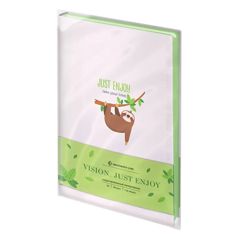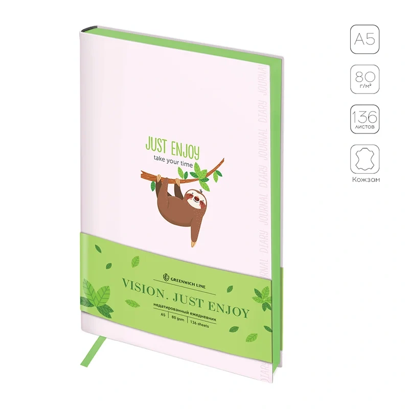 Ежедневник Greenwich Line Vision Just enjoy формата А5 обладает ультрамягкой двухслойной обложкой из высококачественной экокожи. Общий дизайн дополняет срез, отделанный фольгой золотого цвета. Ежедневник недатирован и имеет 136 листов, страницы которого созданы из высококачественной кремовой бумаги повышенной плотности 80 г/м2 с пантонной печатью в 2 краски. Изделие представлено в размере 143 на 210 мм.