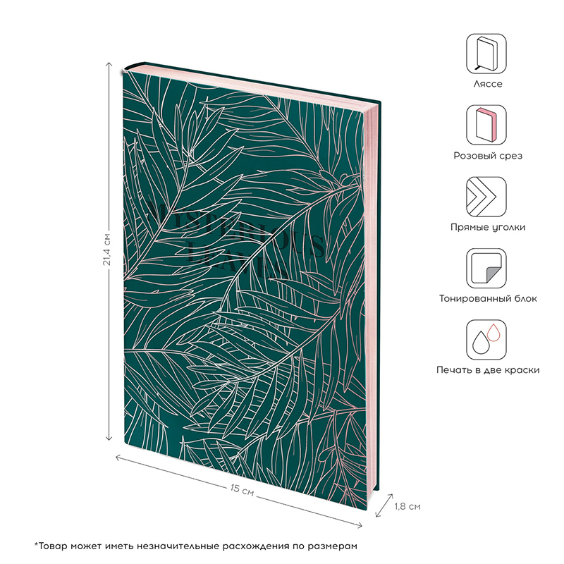 Ежедневник Greenwich Line Vision Pink leaves формата А5 имеет ультрамягкую двухслойную обложку из высококачественной экокожи. Дополняет дизайн срез, отделанный розовой фольгой. Внутренний блок вмещает 136 листов, которые созданы из кремовой бумаги повышенной плотности 80 г/м2 с пантонной печатью в 2 краски. Ежедневник Greenwich Line Vision Pink leaves недатирован и не имеет справочного материала, однако он отлично подходит под персонализацию. Изделие представлено в размере 143 на 210 мм и имеет стильную закладку-ляссе. Ежедневник упакован в индивидуальную упаковку, что гарантирует его целостность и сохранность. • Формат: A5;• Размер: 143*210 мм;• Количество листов: 136;• Материал обложки: экокожа;• Цвет обложки: с рисунком.