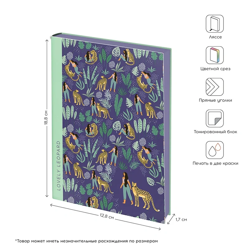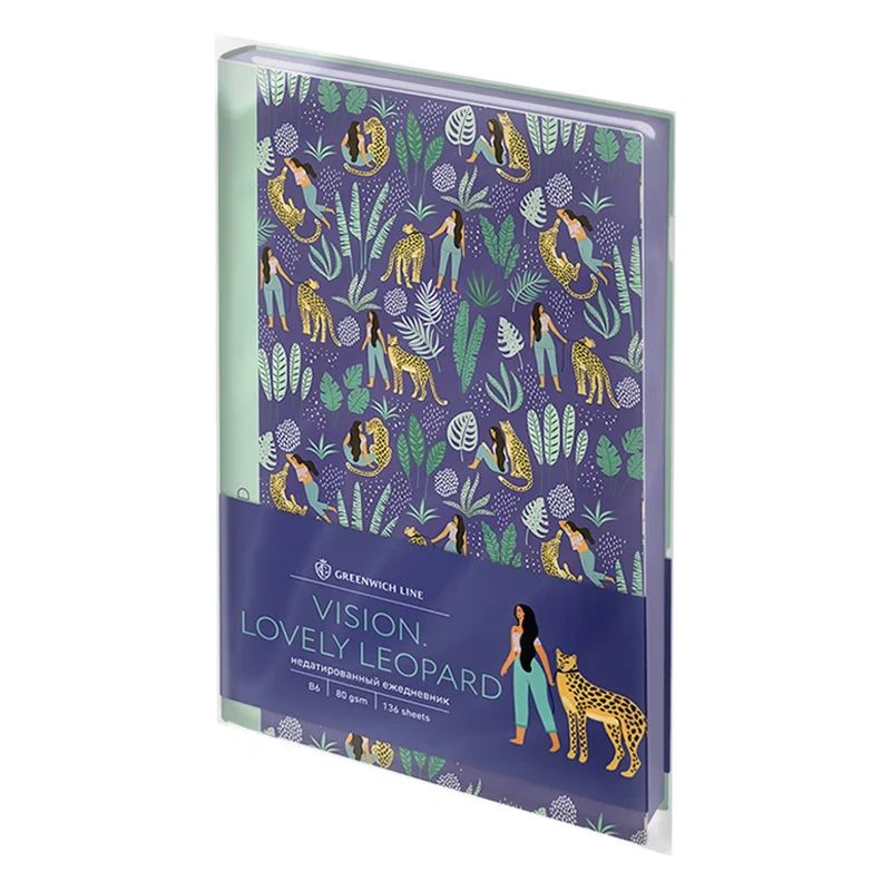 Ежедневник Greenwich Line Vision Lovely leopard формата B6 имеет мягкую обложку, выполненную из высококачественной экокожи. Рисунок изделия дополняет срез блока фиолетового цвета, благодаря чему дизайн кажется завершённым. Ежедневник вмещает 136 листов из кремовой бумаги повышенной плотности 80 г/м2 с пантонной печатью в 2 краски. Greenwich Line Vision Lovely leopard недатирован, однако отлично подходит под персонализацию.