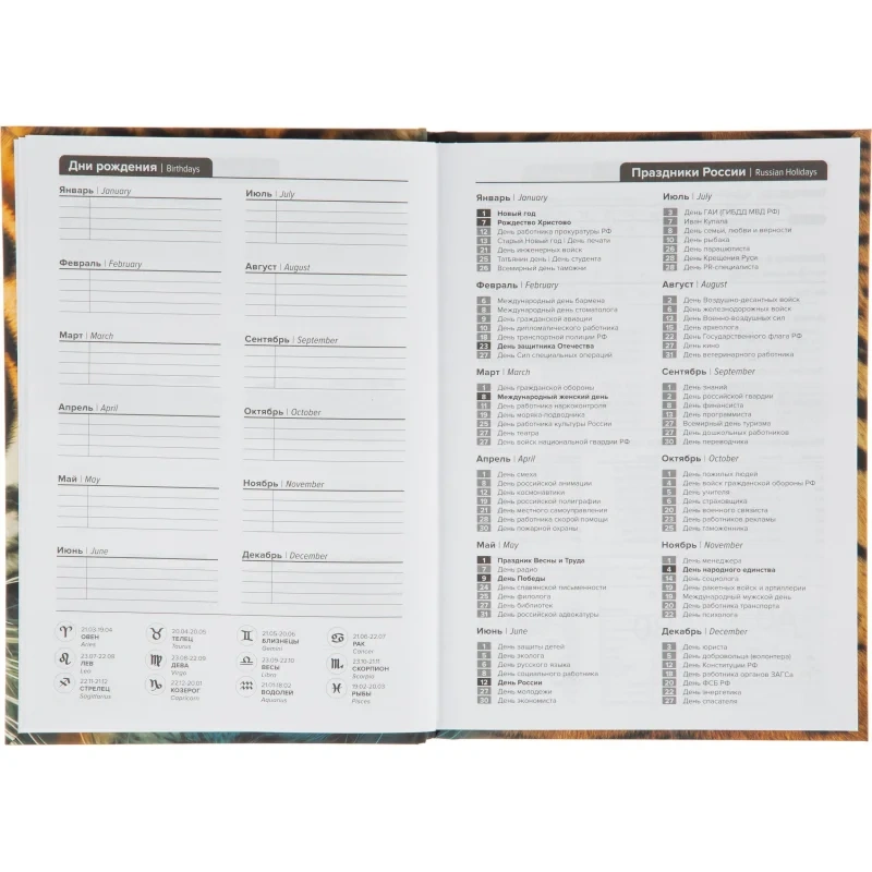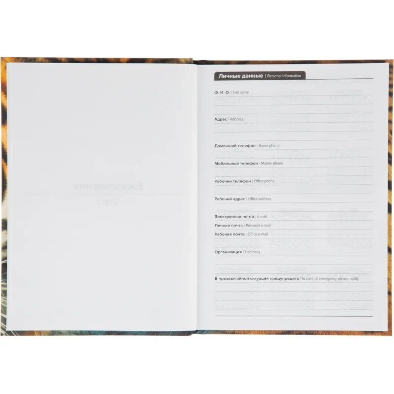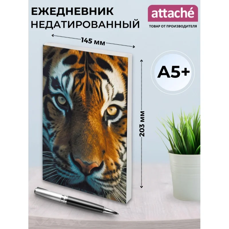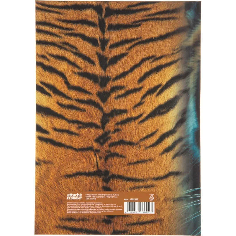 Ежедневник недатированный Attache Economy Взгляд тигра7БЦ Soft Touch А5 128 листов с рисункомЕжедневник подойдёт для записей переговоров и встреч. Обложка выполнена из плотного цветного картона с покрытием Soft Touch, отличается эмоциональным и ярким дизайном с креативным рисунком. Внутренний блок содержит 128 листов белой офсетной бумаги плотностью 55-65 г/кв.м, разлинован и напечатан в одну краску. Листы соединены склейкой для удобства повседневного использования.В ежедневнике предусмотрен информационно-справочный блок. Твёрдая обложка, вертикальная ориентация и компактный размер 14.5x20.3 см делают изделие практичным для работы. Продукт изготовлен в России.