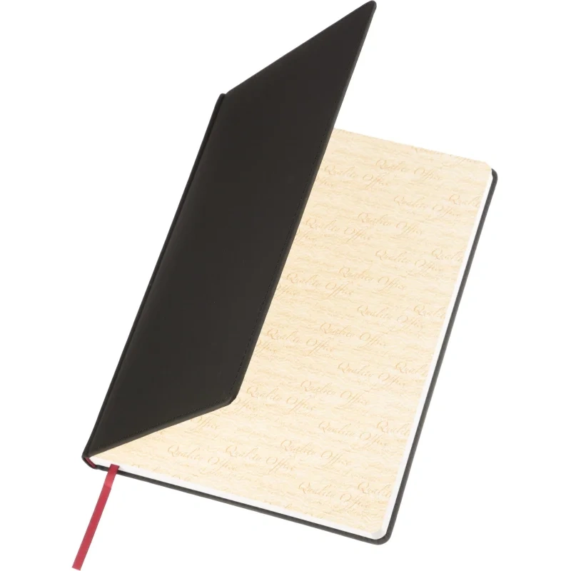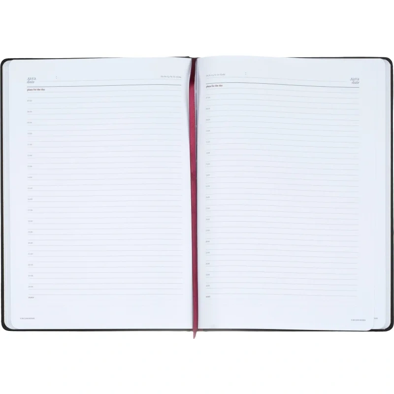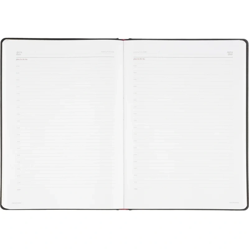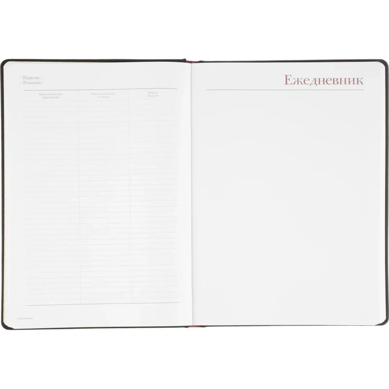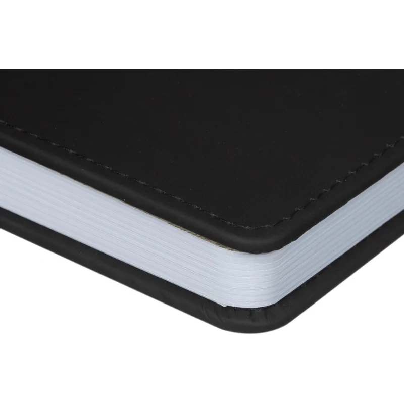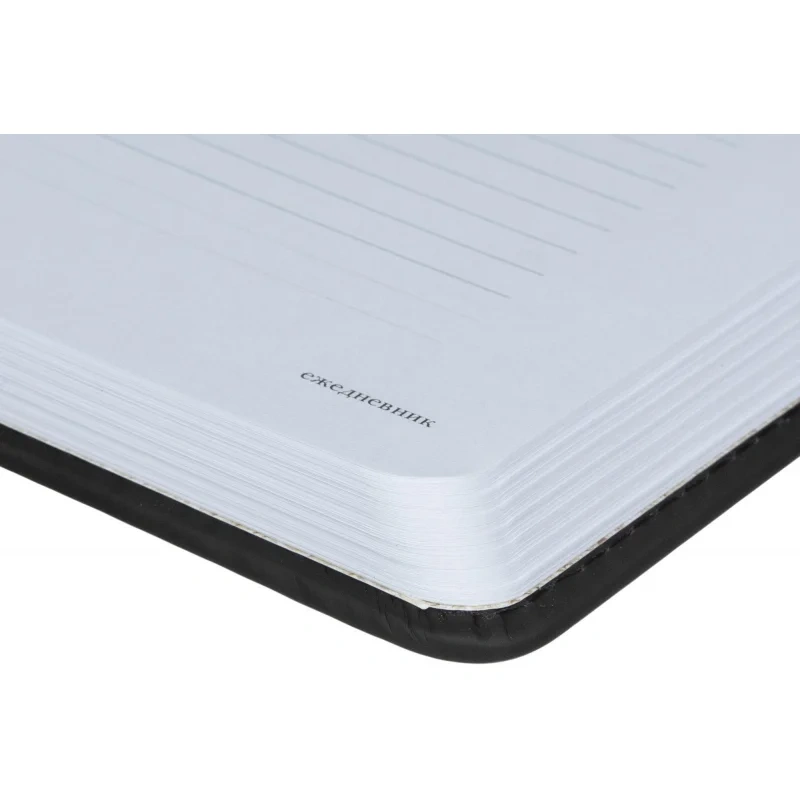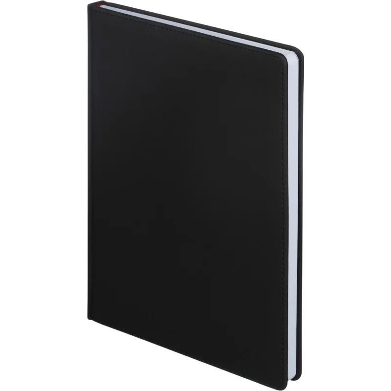 Ежедневник формата A4 с твёрдой обложкой чёрного цвета, выполненной из искусственной кожи, станет отличным выбором для деловых людей. Внутренний блок состоит из 136 листов (272 страницы) белой офсетной бумаги плотностью 90 г/кв.м. с линейкой. Печать выполнена в два цвета.