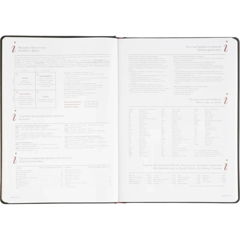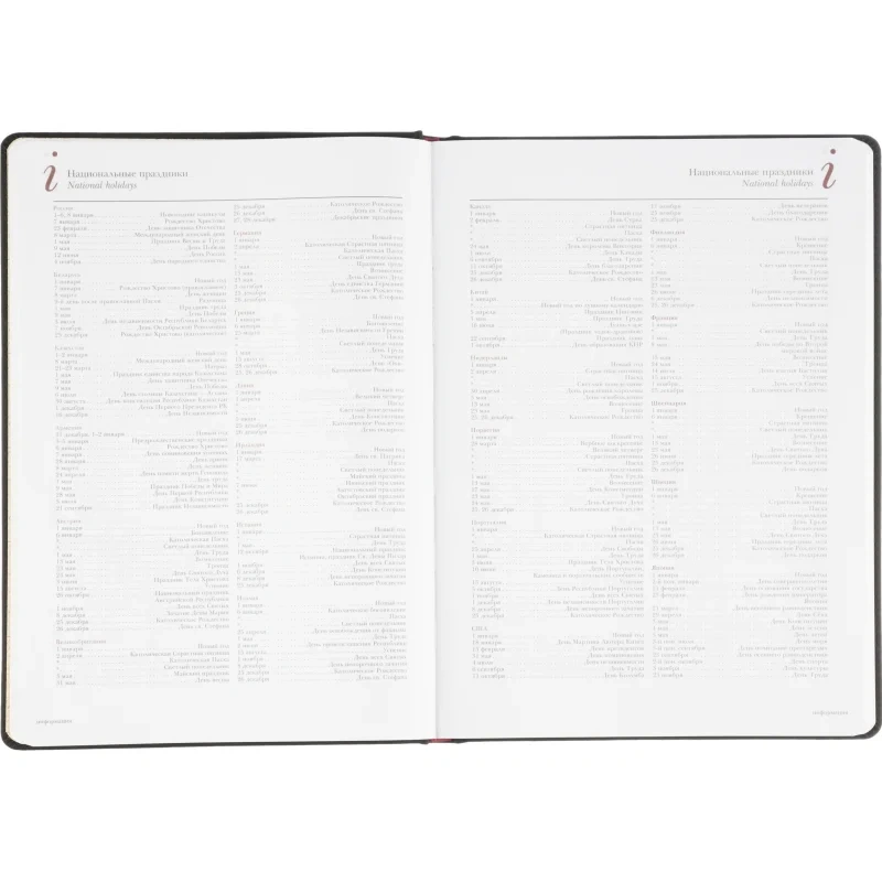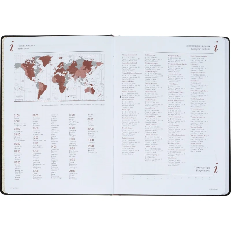 Для удобства в использовании предусмотрено ляссе. Ежедневник крепится с помощью сшивки, что гарантирует долговечность. Внутри содержится информационно-справочный блок с международными кодами городов, цифровыми кодами ГИБДД, телефонами первой необходимости и другими полезными данными. Этот ежедневник готов к персонализации, что делает его идеальным выбором для корпоративных нужд.