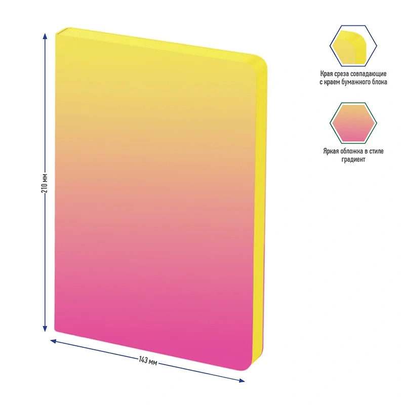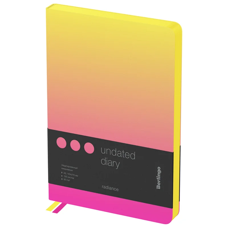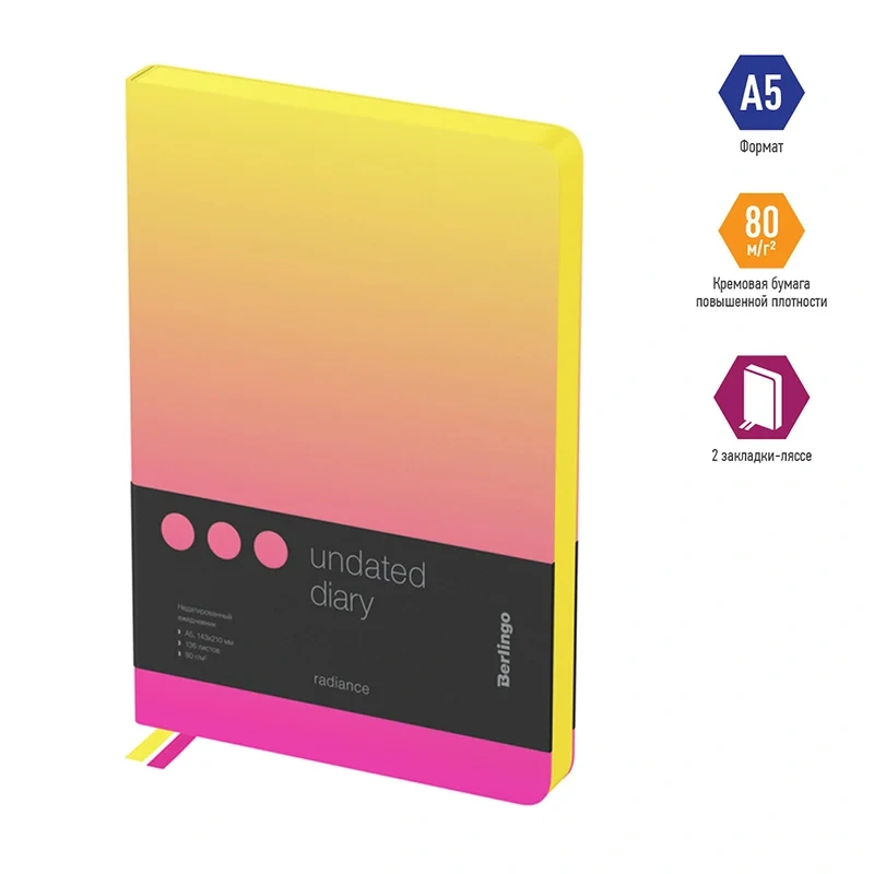 Размер ежедневника составляет 145*217 мм, формат - А5. Внутри содержится 136 листов высококачественной кремовой бумаги повышенной плотности 80 г/м2 с пантонной печатью в 2 краски.